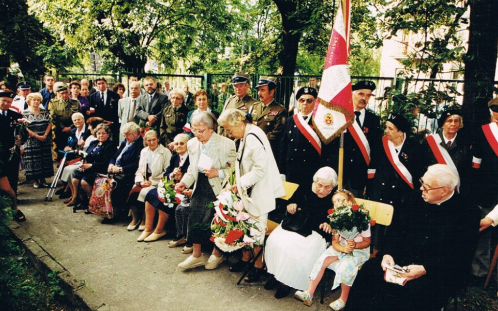 1 sierpnia 2000, odsłonięcie pamiątkowej tablicy na budynku przy ul. Bohaterów Warszawy w którym po wybuchu Powstania Warszawskiego mieścił się szpital polowy. Jadwiga Lesnobrodzka stoi druga z prawej w pierwszym rzędzie.