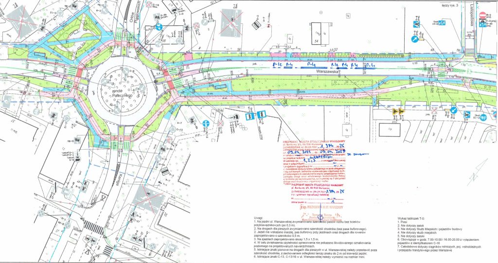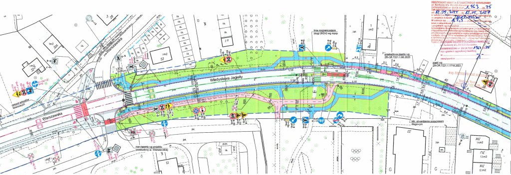 • Po trzecie, na skrzyżowaniu z ożarowską ul. Krańcową (przy STP Mory) zniknie przejście przez trzy pasy ruchu – środkowy zostanie zamieniony w wysepkę. Pozostaną zatem dwa pasy w stronę Ursusa – jeden do jazdy na wprost i w prawo, jeden w lewo. Tutaj również docelowo ma powstać sygnalizacja świetlna – i dobrze, bo gdyby nie stosunkowo niewielki ruch pieszo-rowerowy to skrzyżowanie mogłoby być “maszynką do mięsa”.