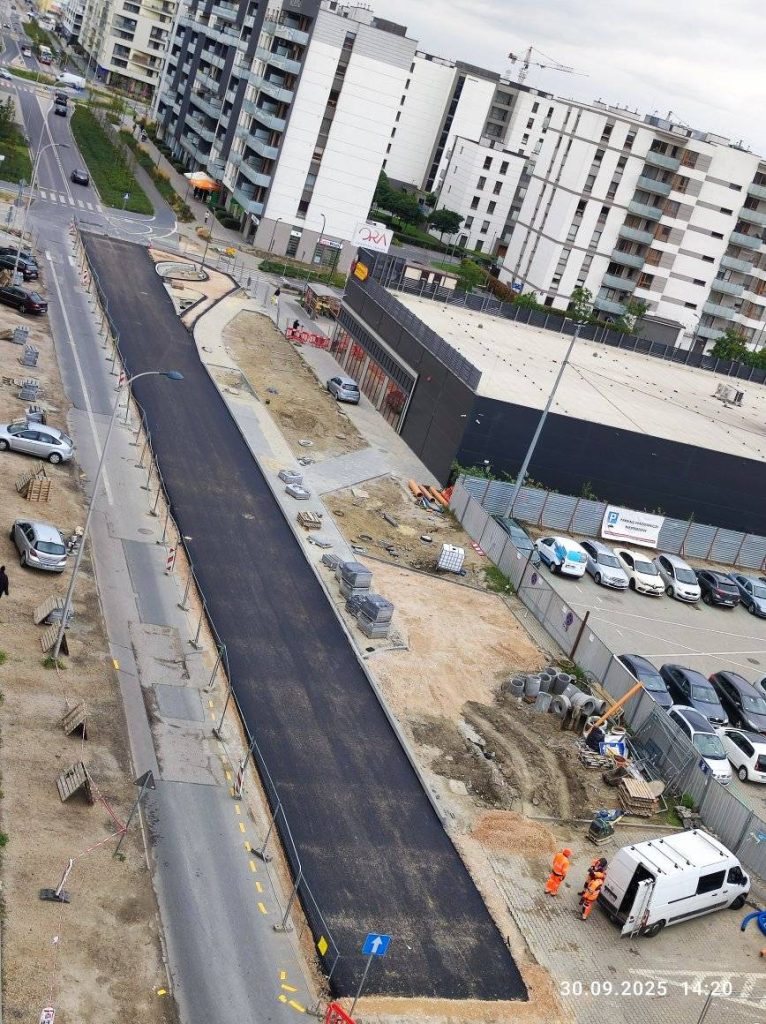 Ulica jest już w zasadzie gotowa, czeka na odbiory i udostępnienie do ruchu. W kolejnym etapie ma powstać chodnik i droga rowerowa wzdłuż al. Jerozolimskich.